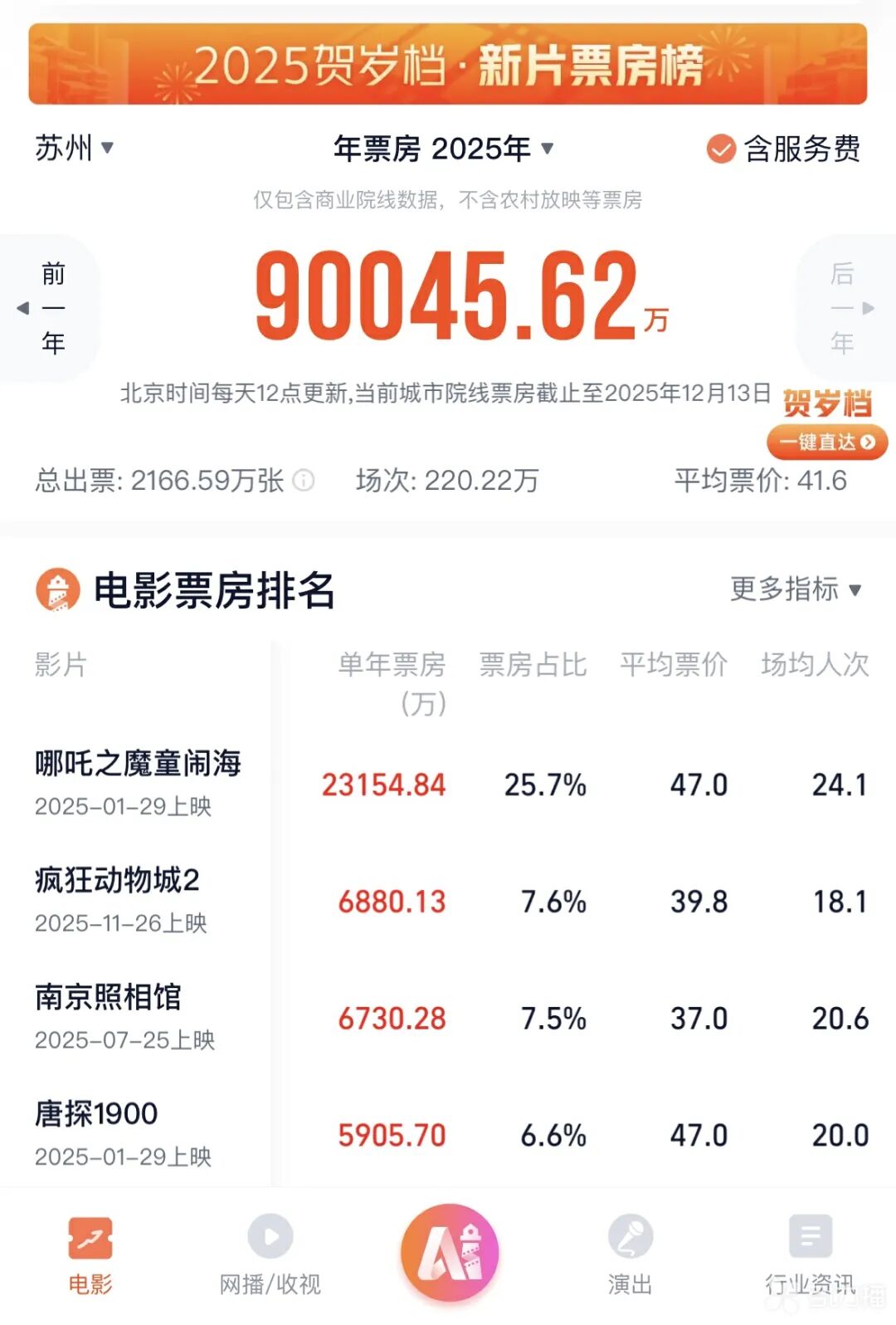 據(jù)燈塔專業(yè)版App數(shù)據(jù),截至昨日上午10點(diǎn)56分,蘇州203家營業(yè)影院2025年票房已超9億元,位居全省首位、全國第九;全年放映場次突破220萬場,吸引近2167萬人次觀影。