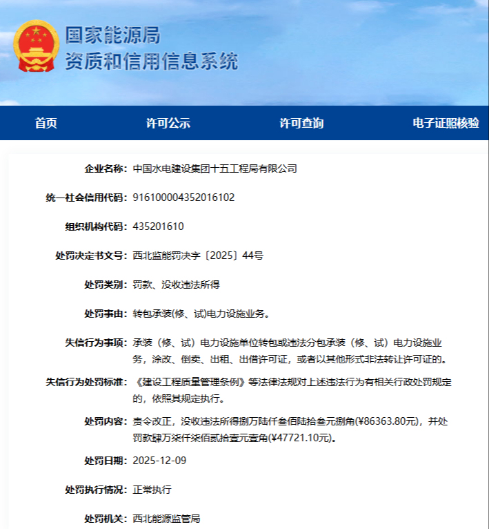 中國水電十五局因轉(zhuǎn)包電力業(yè)務(wù)及許可證失信行為被罰13萬余元