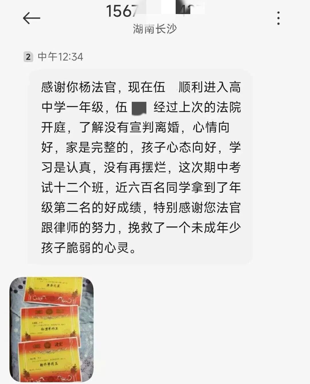 這起案件的意義超越個案。它讓我們思考:離婚率居高不下的當(dāng)下,如何避免孩子成為父母婚姻失敗的“隱形受害者”?我院在家事審判改革中,始終貫穿“未成年人利益最大化”原則,通過家事調(diào)查、心理疏導(dǎo)、案后回訪等機制,將司法保護延伸至法庭之外。每個孩子都應(yīng)在健康環(huán)境中成長,家庭出現(xiàn)問題時,司法應(yīng)是最后的守護者,而非簡單的一刀兩斷。如今小伍的故事仍在繼續(xù),他的獎狀與那條感謝短信,被小心存于案卷,也深深烙印在每位經(jīng)手此案的司法人員心中。