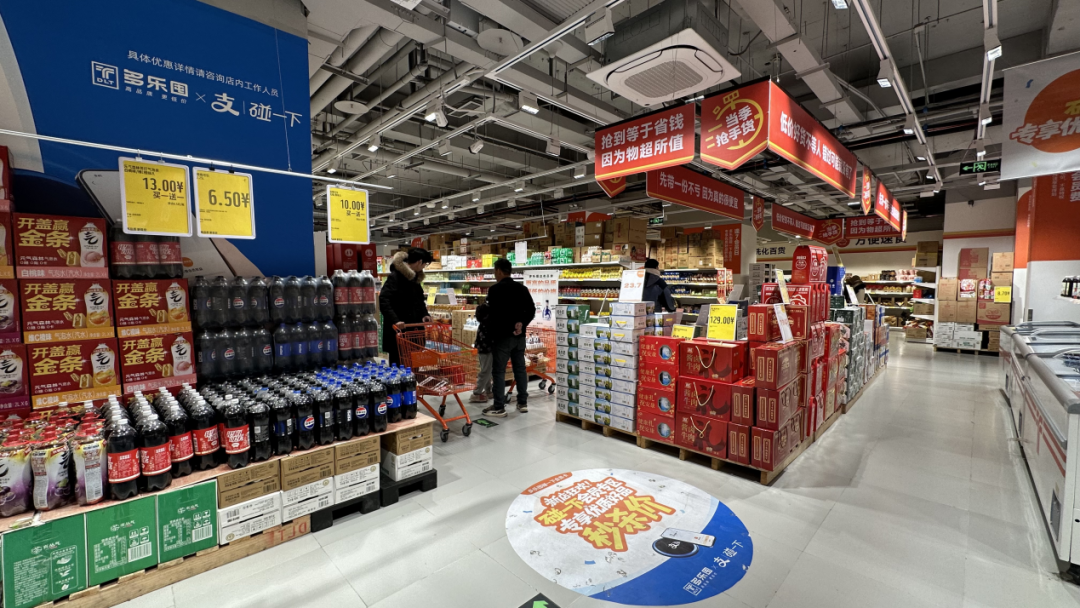 12月12日鄭州初雪,道路結(jié)冰難行,但多樂囤天旺旗艦店晚間仍客流不息,收銀區(qū)排隊(duì)卻結(jié)賬高效,少見翻找手機(jī)或會(huì)員碼的焦灼。作為多樂囤與支付寶碰一下8月合作的鄭州首家聯(lián)名店,門店裝修、海報(bào)、地貼等細(xì)節(jié)可見“橙藍(lán)交融”。