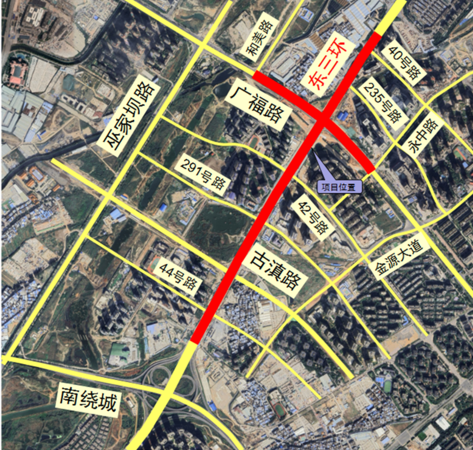 昆明三環(huán)閉合工程東三環(huán)A段(羅衙立交至廣昌立交)項目,起點為羅衙立交(不含該立交),終點為廣昌立交(含該立交)。道路全長約2180米,紅線寬度在60至84米之間,定位為城市快速路,主路設計時速80千米/小時,輔路設計時速40千米/小時。