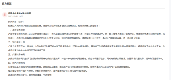 昆明市住房和城鄉(xiāng)建設局回復內容如下: