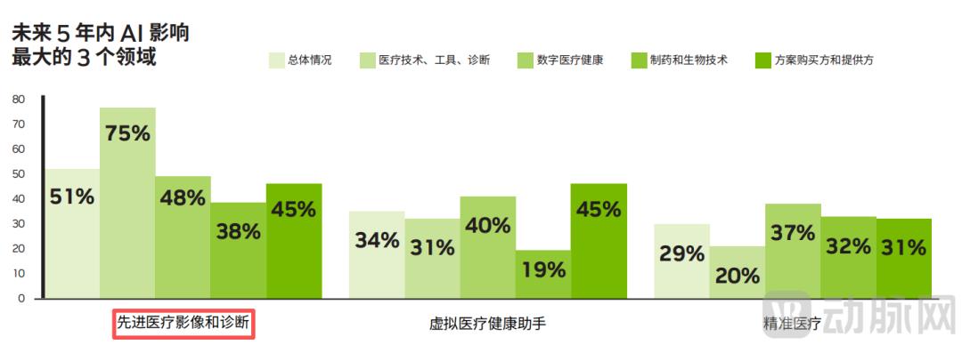 關(guān)于未來5年AI影響最大的領(lǐng)域,51%受訪者認(rèn)為是先進(jìn)醫(yī)療影像和診斷,34%認(rèn)為是虛擬醫(yī)療健康助手,29%認(rèn)為是精準(zhǔn)醫(yī)療(個性化治療)。