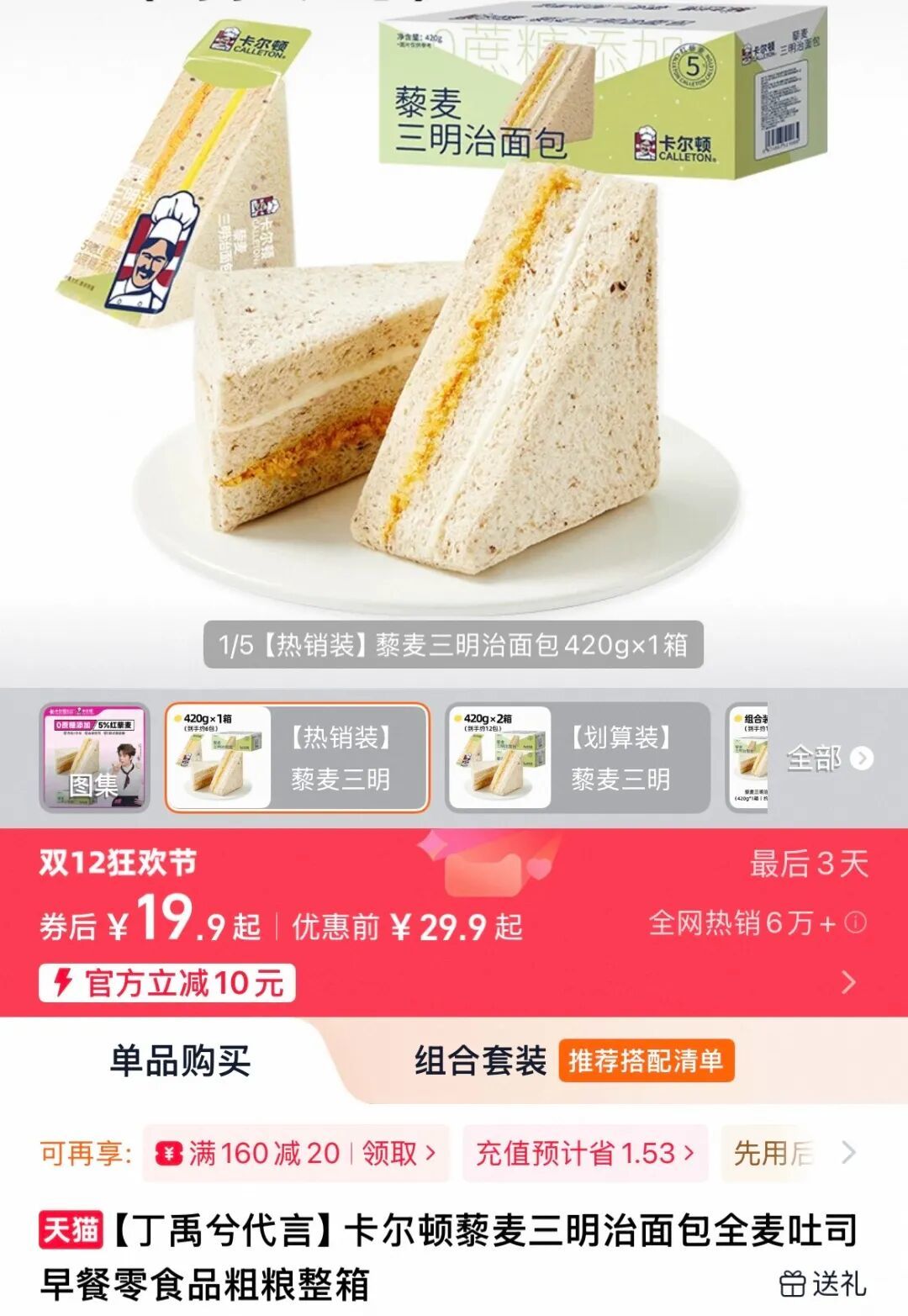 值得注意的是,門店銷售的面包并非蜜雪冰城自制,而是來(lái)自食品品牌卡爾頓的預(yù)包裝產(chǎn)品??栴D官方旗艦店客服向相關(guān)媒體透露,蜜雪冰城門店的面包并非專屬供應(yīng),與電商平臺(tái)同款產(chǎn)品一致,保質(zhì)期均為90天。其中,藜麥三明治和咸蛋黃盒子在線上線下多渠道有售,純奶方吐司僅供應(yīng)線下渠道。