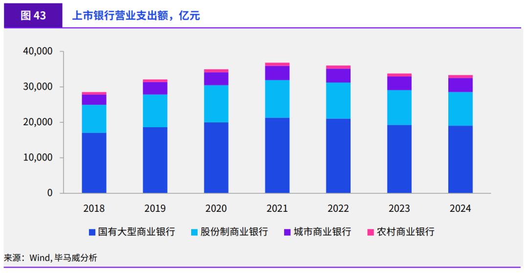 業(yè)務(wù)萎縮的同時(shí),運(yùn)營(yíng)成本和監(jiān)管要求卻在上升。一個(gè)網(wǎng)點(diǎn)一年運(yùn)營(yíng)成本至少200萬(wàn)到500萬(wàn),加上員工工資,總開銷約1000萬(wàn)。中國(guó)金融工會(huì)2024年底報(bào)告顯示,一個(gè)標(biāo)準(zhǔn)柜臺(tái)窗口年成本達(dá)52萬(wàn)元,涵蓋人力、設(shè)備、安全等。2024年上市銀行營(yíng)業(yè)支出3.3萬(wàn)億元,管理費(fèi)用1.8萬(wàn)億元,占比54.7%。此外,監(jiān)管要求日益細(xì)化,從客戶身份核實(shí)到網(wǎng)點(diǎn)環(huán)境,每項(xiàng)都有明文規(guī)定。網(wǎng)點(diǎn)主管常抱怨: