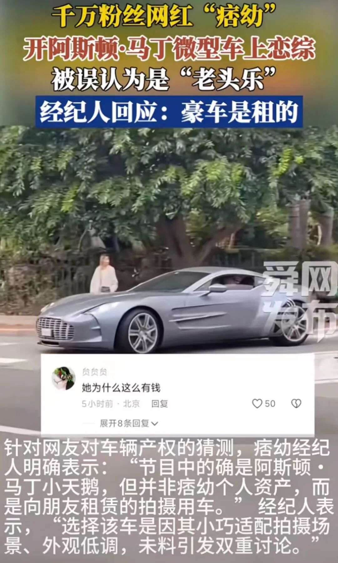 《有你的戀歌2》里圍繞痞幼的一連串鬧劇,就是教科書級(jí)的案例。比如痞幼在節(jié)目里剛出場,開著一輛被誤認(rèn)成“老頭樂”的白色小車,結(jié)果很快被扒出是阿斯頓·馬丁2010年的限量款“小天鵝”,全球不到千臺(tái),國內(nèi)更是屈指可數(shù)。