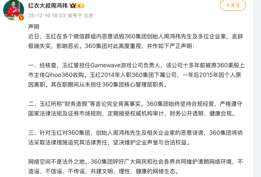 針對此事,周鴻祎通過微博否認了“財務造假”的說法?!敖?jīng)過核查,玉紅曾擔任Gamewave游戲公司的負責人,該公司在十多年前被原360美股上市主體Qihoo360收購。玉紅于2014年進入360集團下屬公司工作,一年后的2015年因個人原因離職。他在職期間從未擔任過360集團核心管理層的職務?!敝茗櫟t表示,360集團會依法采取法律手段追究玉紅的法律責任,堅定維護企業(yè)的聲譽和合法權益。