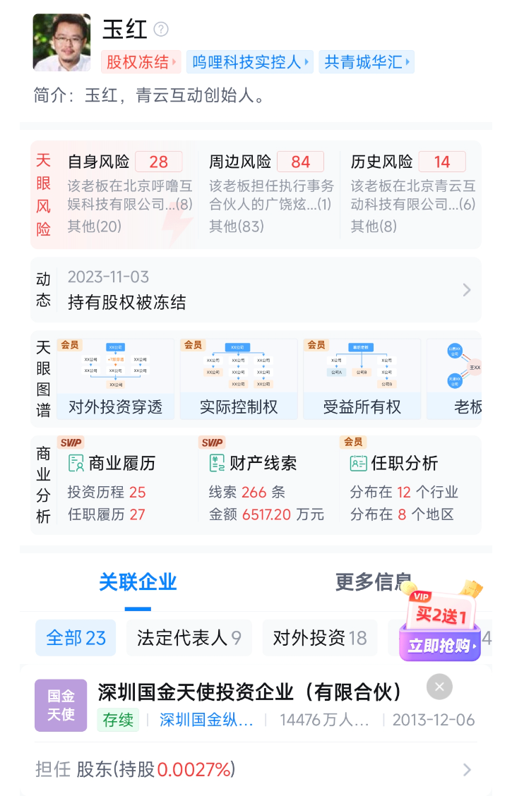 從天眼查可以看到,玉紅目前任職的23家企業(yè)中,有多家已經(jīng)被吊銷營業(yè)執(zhí)照,或者他持有的股份被凍結。