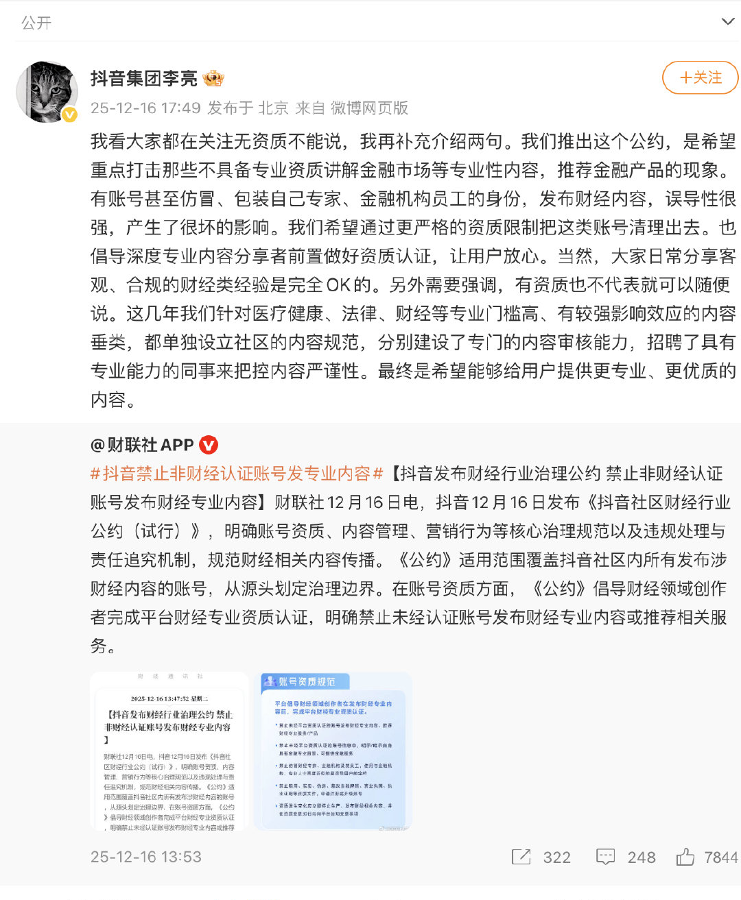 抖音李亮回應(yīng)財(cái)經(jīng)內(nèi)容資質(zhì)問題:有資質(zhì)亦不可隨意發(fā)聲