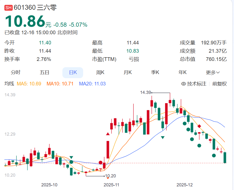 12月16日,三六零的股價(jià)出現(xiàn)下跌,截至當(dāng)天收盤(pán),股價(jià)下跌幅度超過(guò)5%,報(bào)收10.86元,本月以來(lái)的累計(jì)下跌幅度已經(jīng)超過(guò)20%。公司總市值為760.15億元,僅當(dāng)天就蒸發(fā)了超過(guò)40億元。