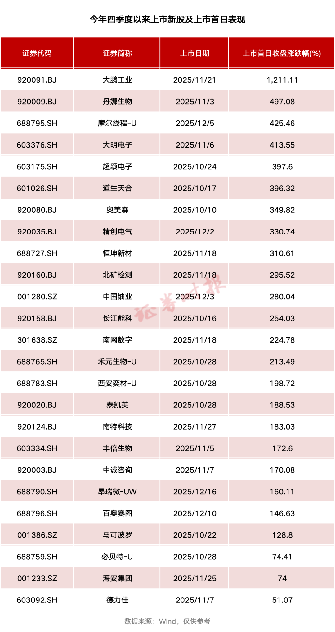 具體來看,四季度以來,大鵬工業(yè)、丹娜生物、摩爾線程-U、大明電子、超穎電子、道生天合、奧美森、精創(chuàng)電氣、恒坤新材等新股的上市首日收盤漲幅均超過300%。其中,大鵬工業(yè)首日收盤漲幅高達(dá)1211.11%,成為2025年以來上市首日收盤漲幅最大的新股。